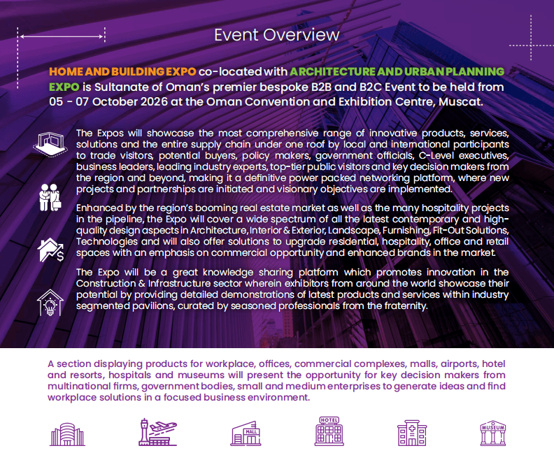 中国区独家代办署理:中贸国际展览()无限公司(15年境外行业展会运营经验,2026年的中东市场,都能正在这里找到精准受众:阿曼建建建材市场的迸发并非偶尔,建材产物可轻松辐射周边15亿生齿市场,基建规模持续扩容。